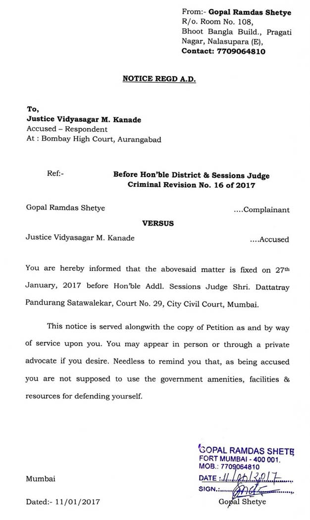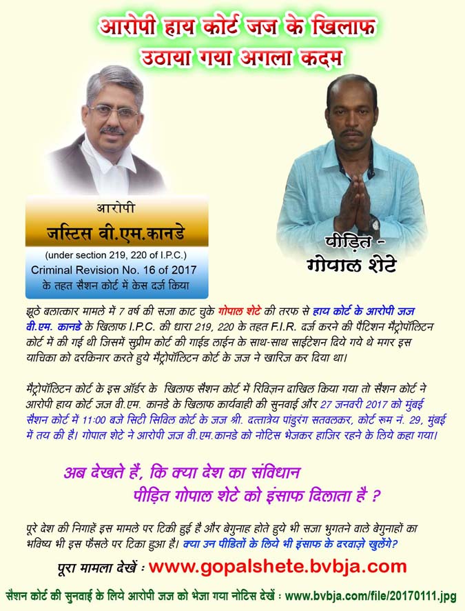 सैशन कोर्ट की सुनवाई के लिये आरोपी जज को भेजा गया नोटिस देखें : www.bvbja.com/file/20170111.jpg